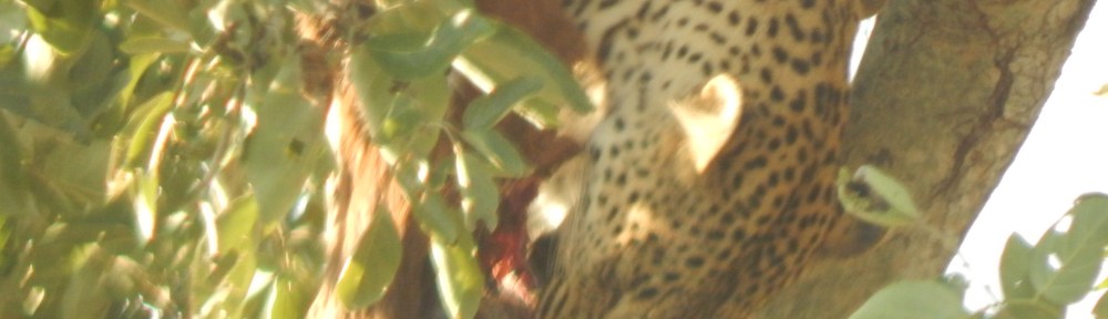 5 This Leopard was knoshing on a Bushbuck in a tree next to the blacktop road. We were on of about a dozen cars stopped and watching. After a minute or two he/she climbed down out of the tree walked over to the left about 200 feet and laid down in the grass and rested. Leopards are one of the Big 5 and we fortunately saw all 5. ( 1 Leopard, 5 Lions, 5-6 Cape Buffalo, 3 Rhino and 50++ Elephants).