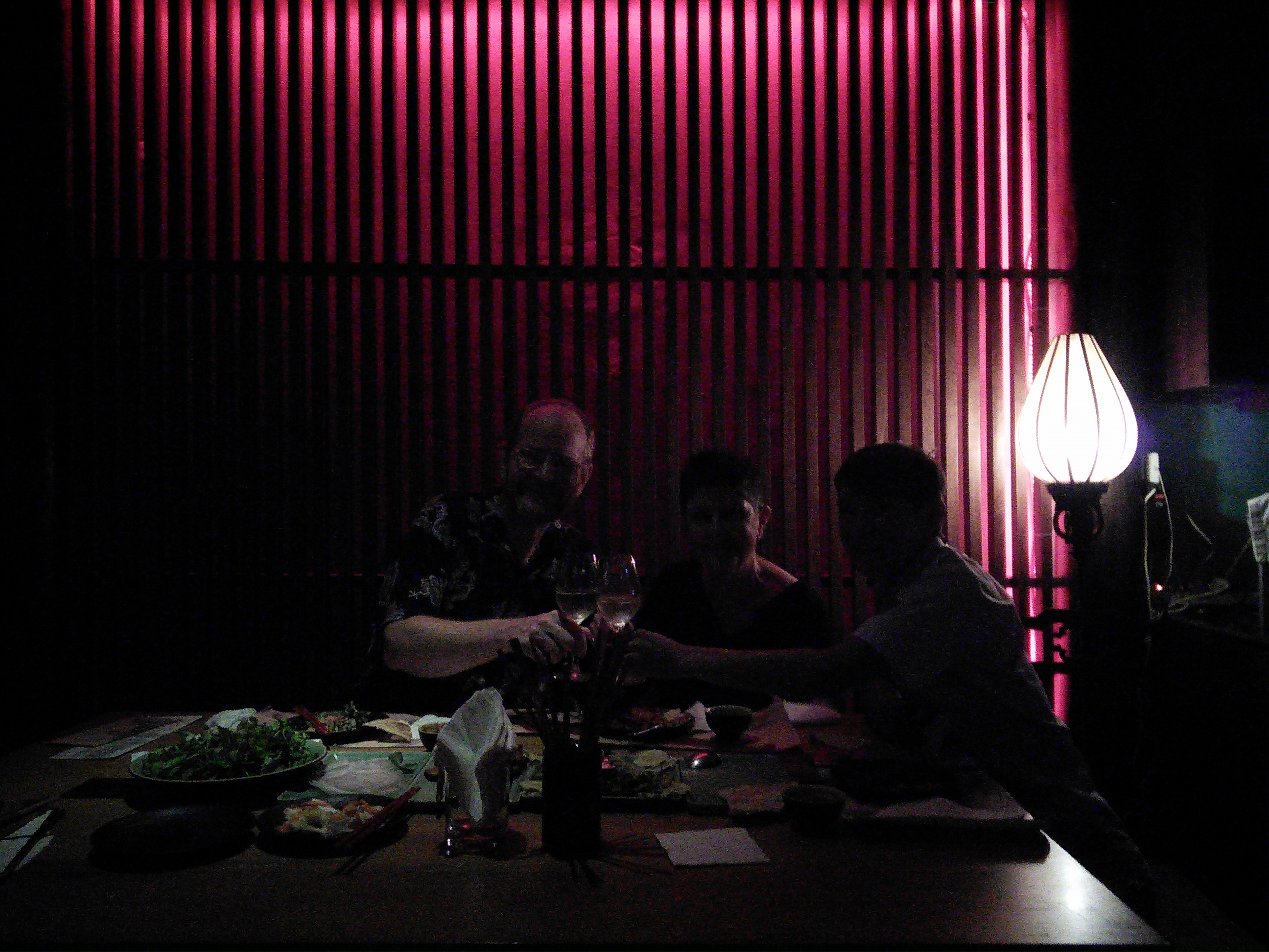 He greeted us last night with hugs and a kiss for mom. We had the usual wonderful bottle of New Zealand sauvignon blanc. We caught up on the last year. He invited us to dinner tonight at that Q Bar. He had a private table reserved in the back for us. The three of us pigged out on a real Vietnamese feast. The photo is pretty grainy.