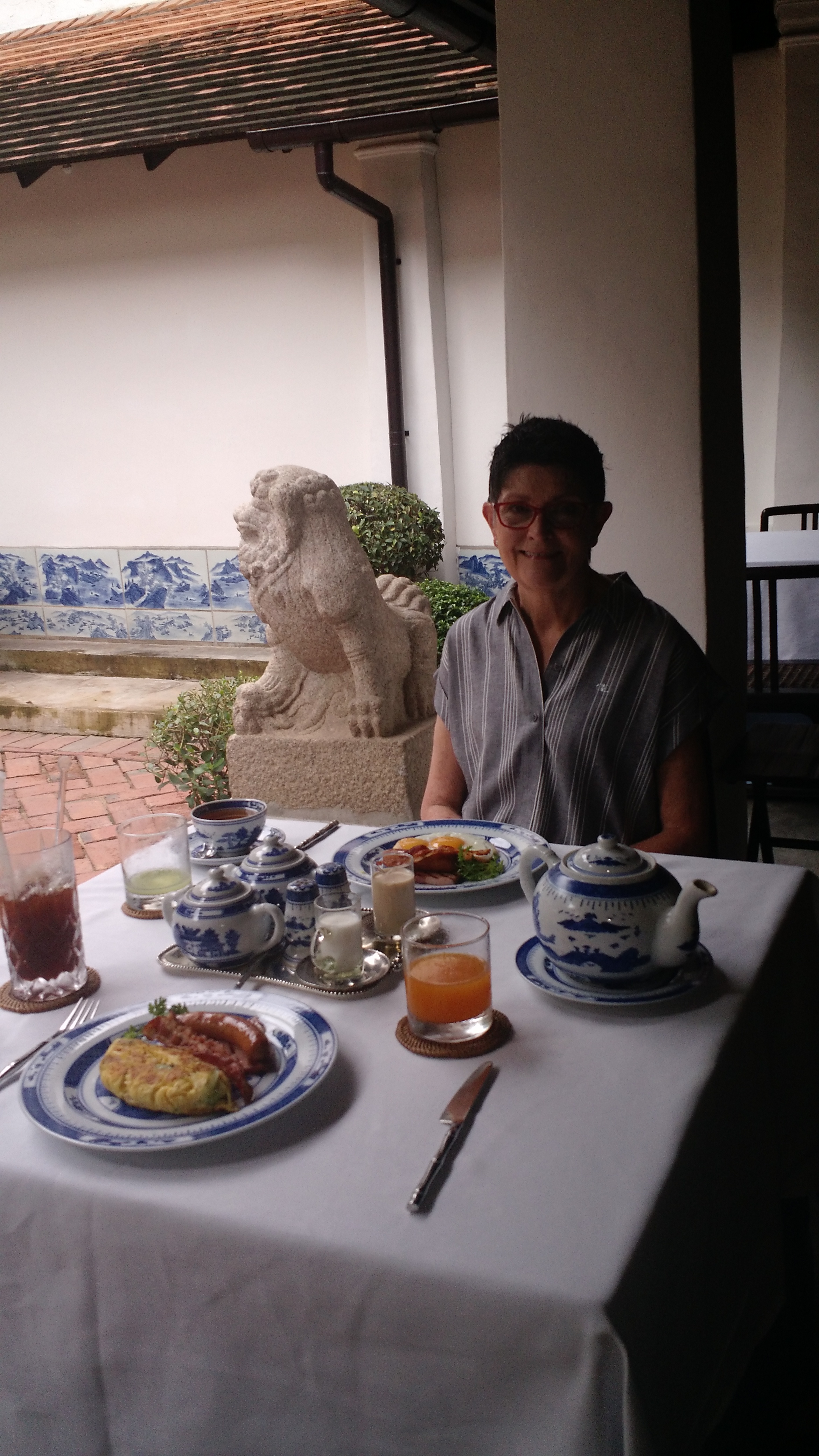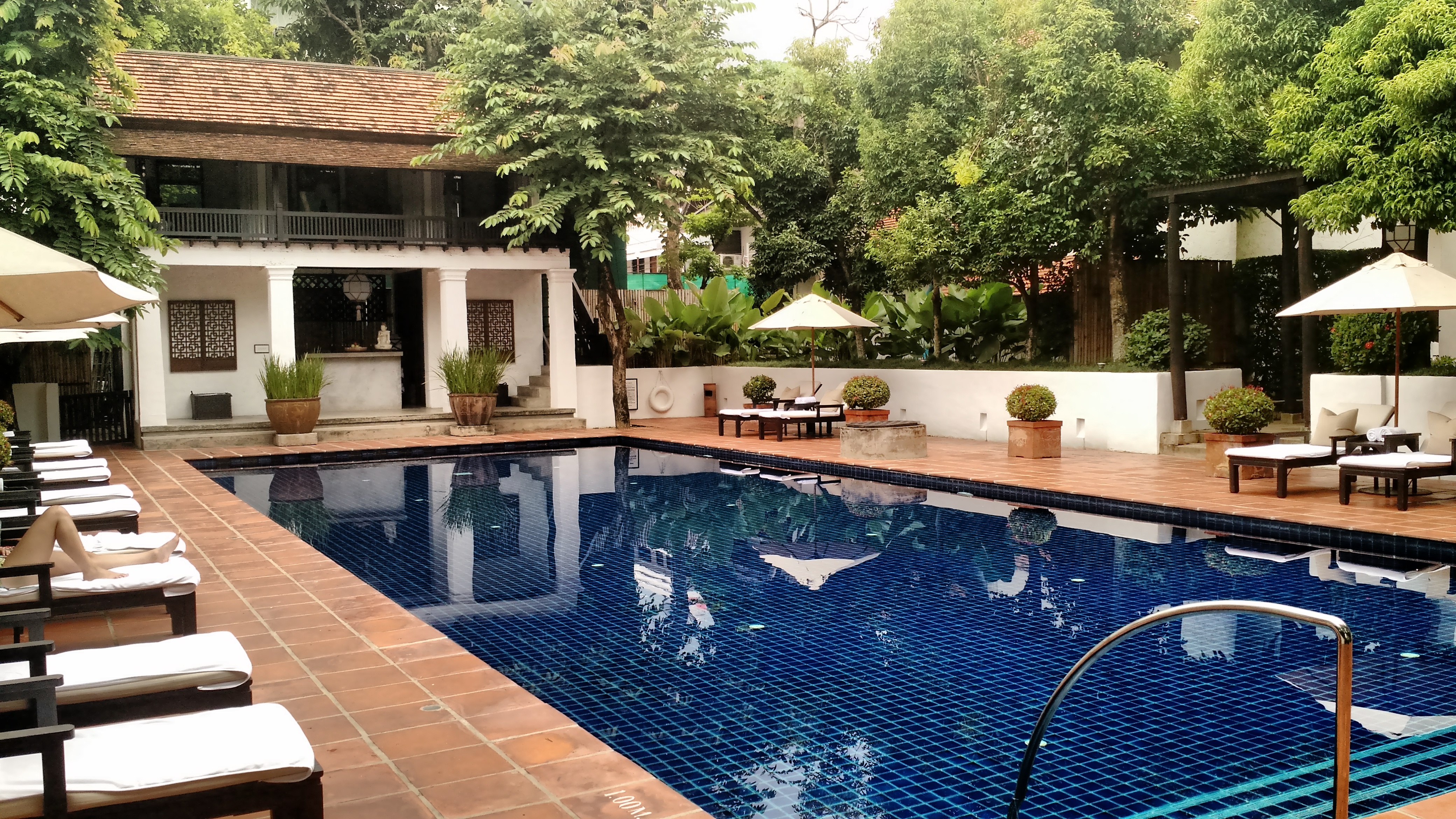 There are two open center courtyards. The building between the two courtyards is an open air sala with cinnabar lacquer columns furnished with sofas, chairs and framed art. The perfect place for our first glass of wine. We up the ceiling fan to high to keep the mosquitoes away. Classical music plays softly in the background. We hang out at the pool after a hot sweaty day in town. We get there around 4PM and move to the sala for wine time.