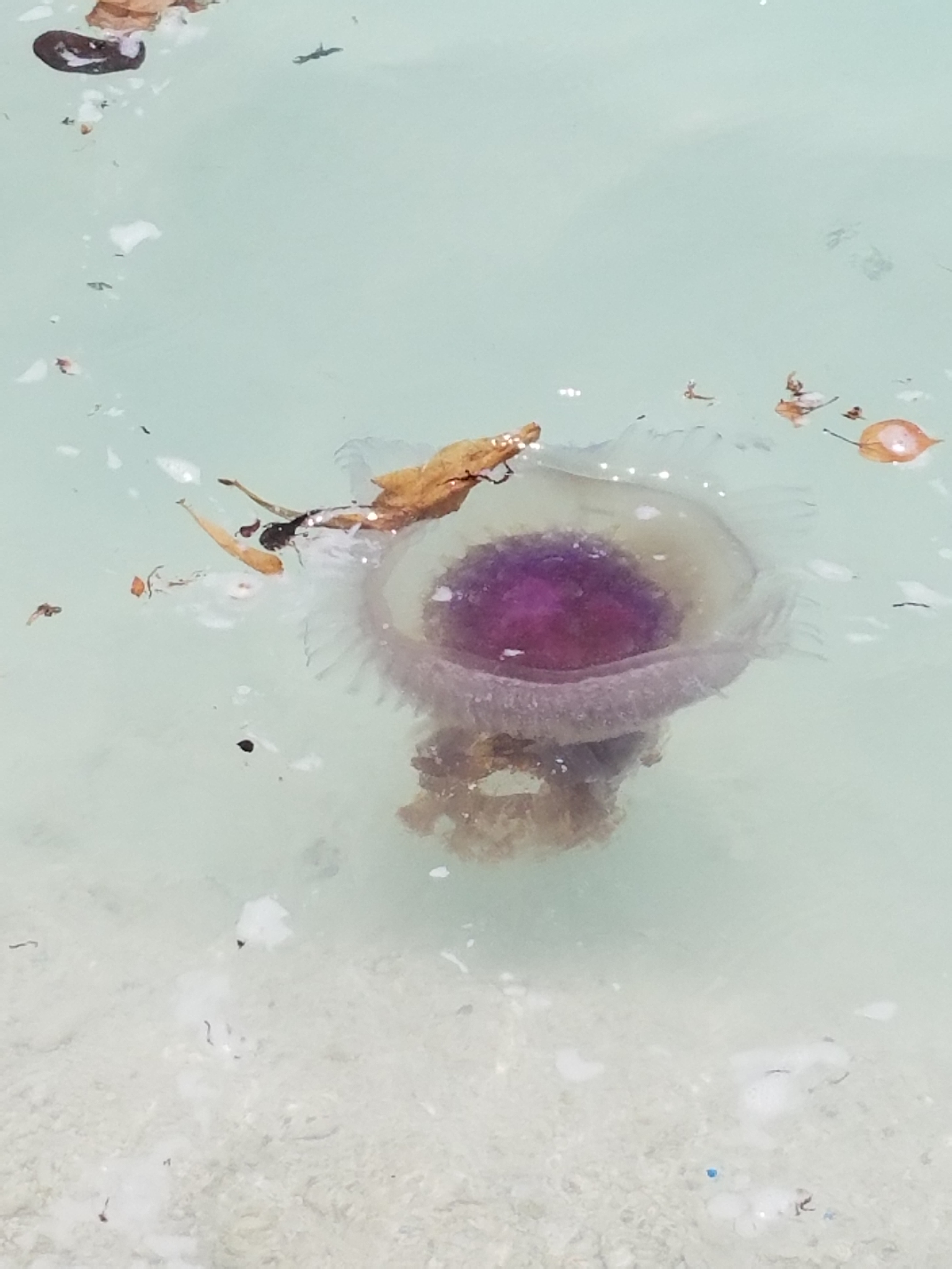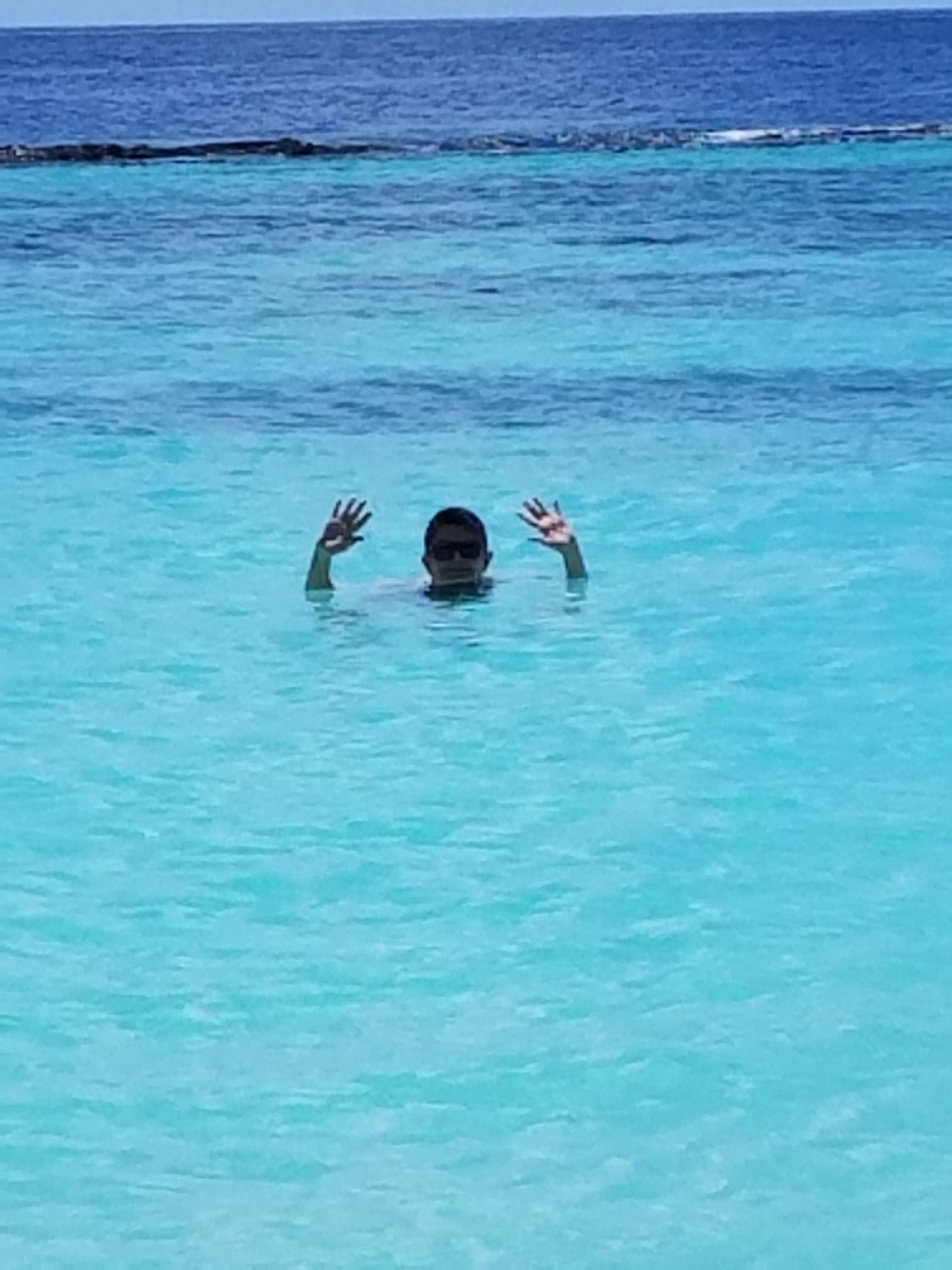 This afternoon we go out on a glass bottom boat to explore the amazing sea life amongst the coral reefs surrounding our little island. We walked around the island in 15 minutes. Just watched a 5 ft. long shark swim idly by in front of chaise lounges, about 25 ft. out in our lagoon. We were swimming there 15 minutes before. These sharks are plentiful and don’t like people. Guess we taste bad.